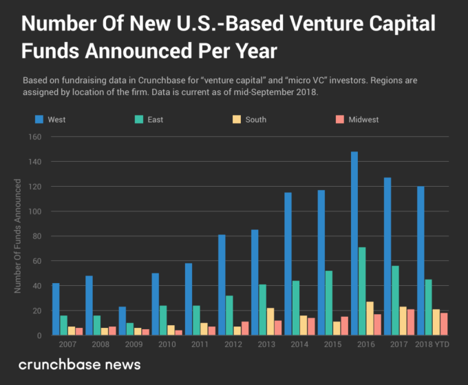 We’re able to see how the pace of venture fund creation varies by region. In the highly unlikely event you didn’t already know that the East and West coasts are responsible for the bulk of venture fund creation, the above chart makes that fact plainly obvious.
