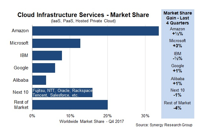 It’s also possible that the fact that Amazon controls the largest chunk of the cloud infrastructure market, might play here at some level. While Microsoft has been coming fast, it’s still about a third of Amazon in terms of market size, as Synergy Research’s Q42017 data clearly shows.