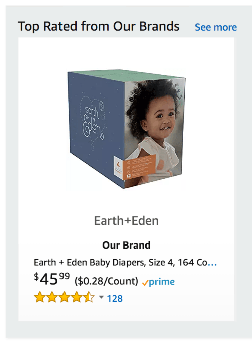 Multiple sources initially told TechCrunch the diapers were a new private label. In addition, the listing for the Earth + Eden diapers shows up under a heading entitled “Our Brands” when shoppers search for baby diapers on Amazon’s site. (See photo below)