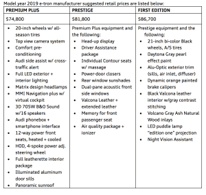 In contrast, Audi offers the same powertrain and battery throughout the e-tron’s trim levels. For $81,700 buyers get the same range as the base model but gain additional creature comforts like a heads-up display, massaging seats and parking assist technology. For $86,700 buyers can opt for the First Edition package that includes larger, 21-inch wheels, limited paint, and interior trim and a night vision mode.