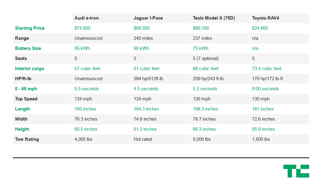 The Audi e-tron closely matches up with the Jaguar I-Pace. Jaguar recently announced its electric crossover and is nearing delivery of the first vehicles. Compared to the e-tron, the I-Pace has a similar range, speed, and slightly less interior space. Pricing for the I-Pace starts at $69,500.