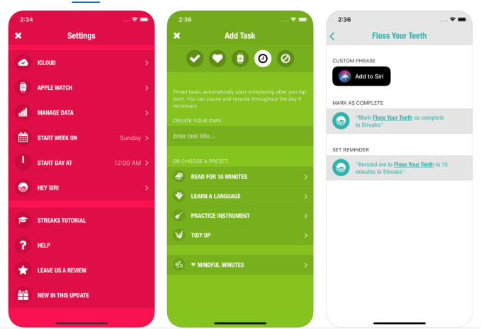 Habit-tracker Streaks is also among the first to include an “Add to Siri” button. When tapped, users can record custom phrases to complete their tasks. That way you can say things in a more natural style – like, “Hey Siri, I drank my water,” or “I ate healthy today.”