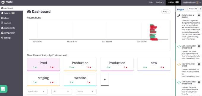 Instead of looking at the code level, Mabl looks at your website or service and alerts you to errors like increased load time, broken links or other problems, and displays the results in a dashboard. When it finds an issue, it flags the step in the process where the problem occurred and sends a screenshot to the test or development team where they can analyze it and fix it if needed.