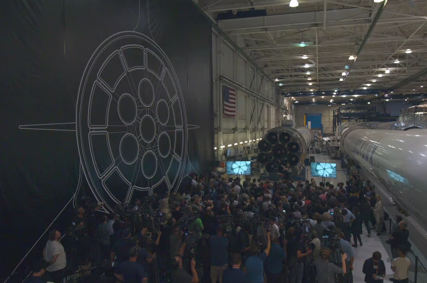 “I mean, this is a ridiculously big rocket,” he added. The illustration on the wall, he pointed out, is life-size. As you can see it dwarfs the crowd and the other rockets.