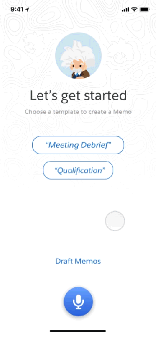 For the meetings notes part, instead of typing on a smartphone, which can be a challenge anyway, you simply touch Meeting Debrief in the Einstein Voice mobile tool and start talking to enter your notes. The tool interprets what you’re saying. As with most transcription services, this is probably not perfect and will require some correcting, but should get you most of the way there.