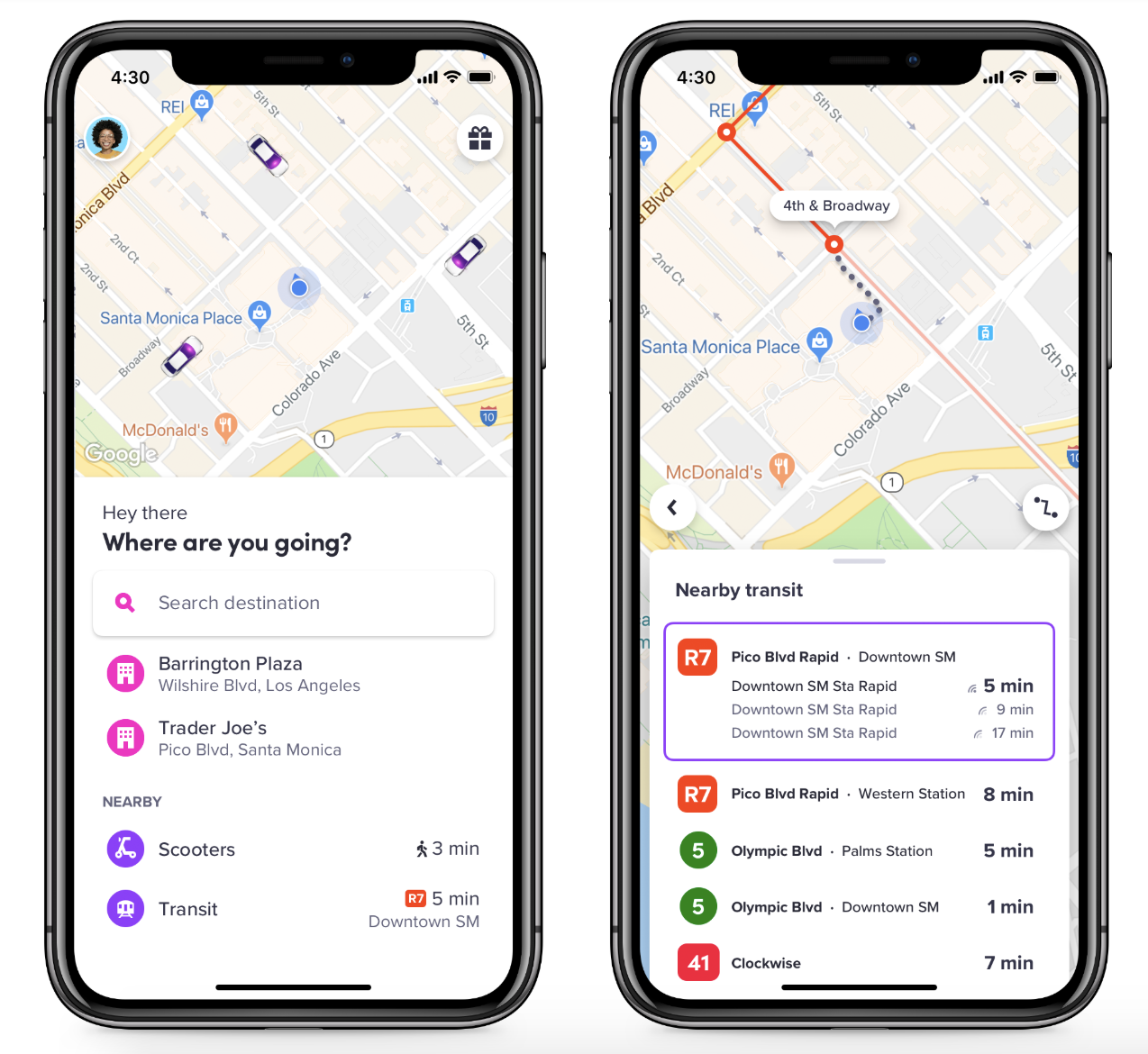 Today, Lyft customers in Santa Monica will see the Nearby Transit option, which includes route information and schedules for the Big Blue Bus, LA Metro and Metrolink. The feature is in partnership with Trafi, a transit information platform.