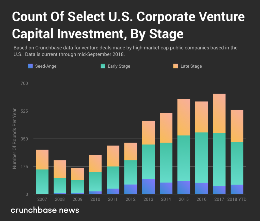 The number of rounds these big corporations invest in is on track to set a new record in 2018. Keep in mind that there’s a little over one full quarter left in the year. And although the holidays tend to bring a modest slowdown in venture activity over time, there’s probably sufficient momentum to break prior records.