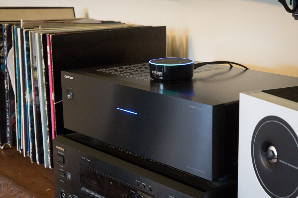 Echo devices are everywhere in my house. They’re in three bedrooms, my office, our living room, my workshop and outside on the deck. But besides the Tap in the workshop and Echo in the kitchen, every Echo is connected to an amp and speakers. For instance, in my office, I have an Onkyo receiver and standalone Onkyo amp that powers a pair of Definitive Technology bookshelf speakers. The bedrooms have various speakers connected to older A/V receivers. Outside there’s a pair of Yamaha speakers powered by cheap mini-amp. Each system sounds dramatically better than any smart speaker available.
