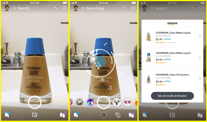 Users can use Snapchat’s camera to scan a physical object or barcode, which brings up a card showing that item and similar ones along with their title, price, thumbnail image, average review score and Prime availability. When they tap on one, they’ll be sent to Amazon’s app or site to buy it. Snapchat determines if you’re scanning a song, QR Snapcode or object, and then Amazon’s machine vision tech recognizes logos, artwork, package covers or other unique identifying marks to find the product. It’s rolling out to a small percentage of U.S. users first before Snap considers other countries.