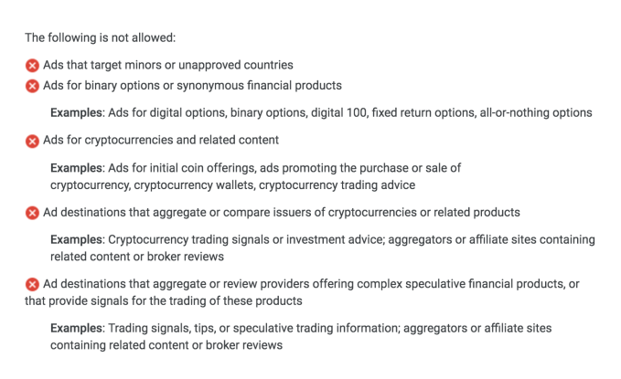 But the October 2018 policy update says that “regulated cryptocurrency exchanges” will be allowed to advertise in the U.S. and Japan.