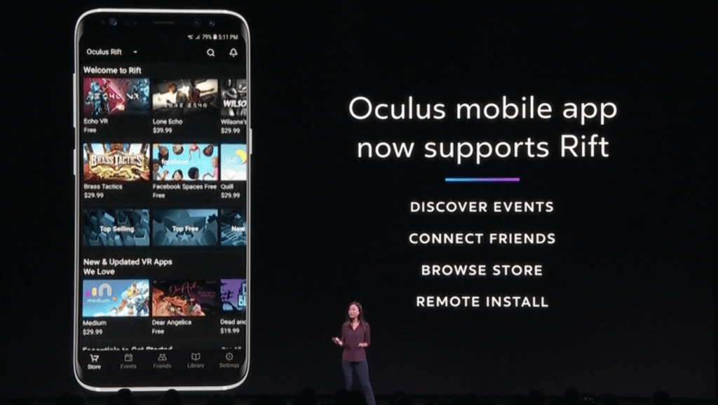 Today at its Oculus Connect 5 keynote, the company announced that its mobile app for iOS and Android will now connect to the company’s Rift headset allowing users to browse the desktop store and remote install games and apps. Previously the mobile app only worked with the $199 Oculus Go standalone headset.