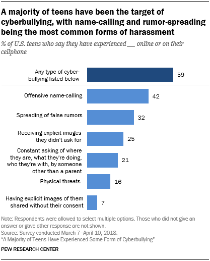 A majority of U.S. teens have been subject to online abuse, according to a new study from Pew Research Center, out this morning. Specifically, that means they’ve experienced at least one of a half-dozen types of online cyberbullying, including name-calling, being subject to false rumors, receiving explicit images they didn’t ask for, having explicit images of themselves shared without their consent, physical threats, or being constantly asked about their location and activities in a stalker-ish fashion by someone who is not their parents.