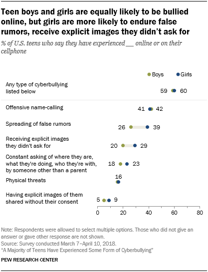 Pew also found that girls and boys are both harassed online in fairly equal measure, with 60% of girls and 59% of boys reporting having experienced some sort of online abuse. That’s a figure that may surprise some. However, it’s important to clarify that this finding is about whether or not the teen had ever had experienced online abuse – not how often or how much.
