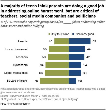 A majority – 59% – of U.S. teens say their parents are doing a good job with regard to addressing online harassment. However, 79% say elected officials are failing to protect them through legislation, 66% say social media sites are doing a poor job at stamping down abuse, and 58% of teachers are doing a poor job at handling abuse, as well.