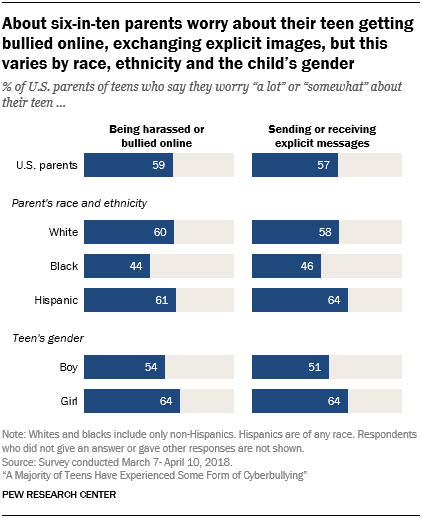 Parents, in particular, are worried about teens sending and receiving explicit images, with 57% saying that’s a concern, and a quarter of them worry about this “a lot.” And parents of girls worry more. (64% do.)