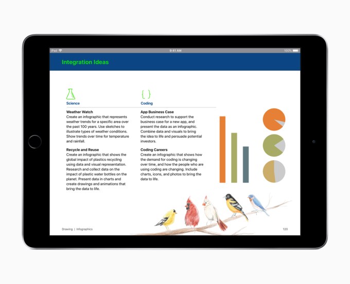 Included in the curriculum are four project guides for drawing, music, video and photos, each with a series of projects that build skills progressively. In total, there are 300 lesson plan ideas across media, projects and subjects. Not all are focused on the creative arts, to be clear. For example, a math teacher can use the iPad camera’s burst mode to capture the arc of a basketball toss to measure its parabola, the company explains in its announcement. Students can also use the camera to learn about fractals or use Apple Pencils and apps to learn about symmetry.