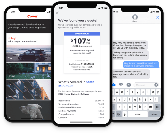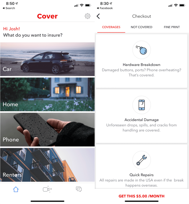 So they built Cover, where you don’t have to cobble together an endless set of insurance websites or wait on hold. You download the app, pick your item, list how much you paid and where, provide some photos or video of its condition using its TensorFlow-equipped camera and Cover will check across its insurance partners and find you the best quote instantly. You can easily see what is and isn’t covered, learn how to make claims, and text with an agent if you have questions. For example, I was quickly quoted $5 per month to insure my new iPhone against damage but not loss or theft.