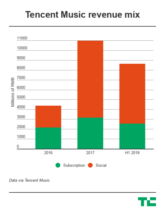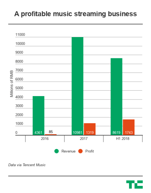 A large part of that success is its connection to Tencent services — in particularly WeChat, which counts one billion users, and QQ but also Tencent Video — which give Tencent Music’s services an avenue to reach users and spread across friend graphs and networks. That’s helped keep marketing expenses down and ultimately make the company profitable. Tencent Music’s cost of revenue is 60 percent, versus nearly 75-85 percent for Spotify which has to do a lot more work to bring users in.