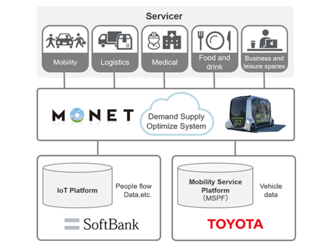 Called MONET — after ‘mobility network’ — the joint venture will essentially assign autonomous vehicles to various different “just in time” services. That just in time caveat essentially means more than on-demand. SoftBank suggests it’ll mean that services are performed in transit. That could be food prepared as it is delivered, hospital shuttles that host medical examinations, or mobile offices, according to examples given by SoftBank.
