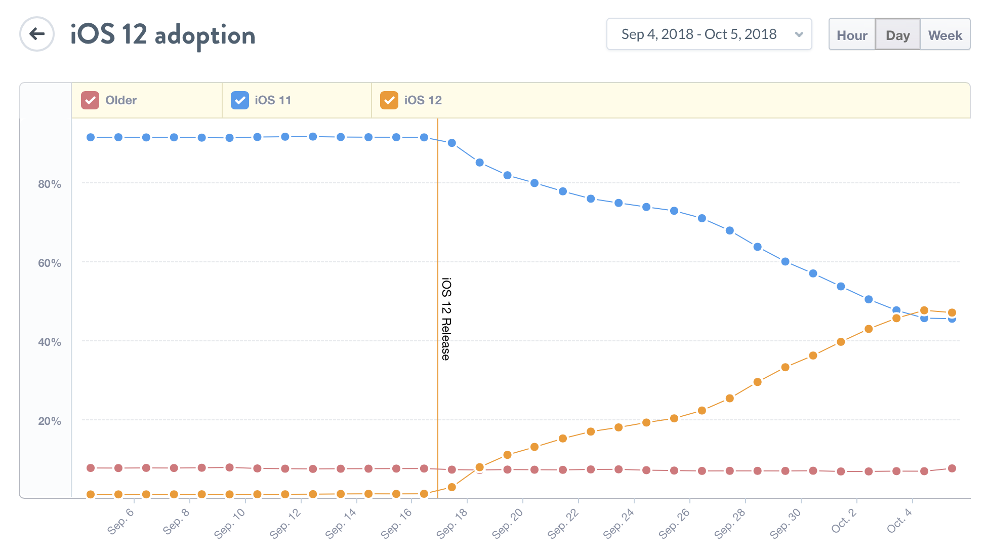 With iOS 11, it took much longer to reach that level. Last year, Apple announced on November 6th that iOS 11 was more popular than iOS 10. Sure, Mixpanel and Apple don’t have the exact same numbers, but you can already see that the trend is different this year.