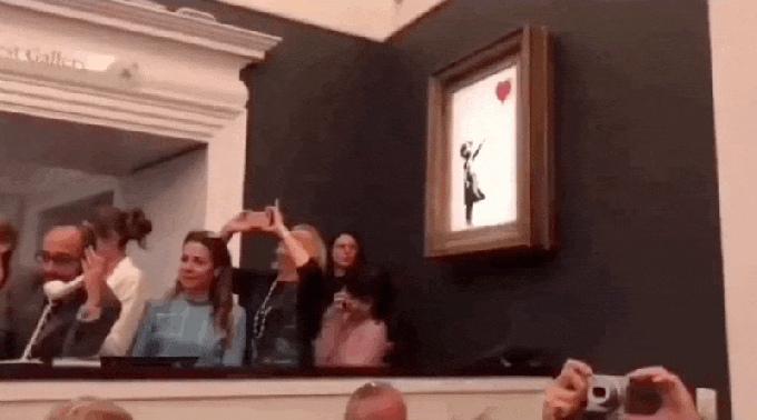 Banksy posted a too-perfect still of the shred in process, with the caption “Going, going, gone…”