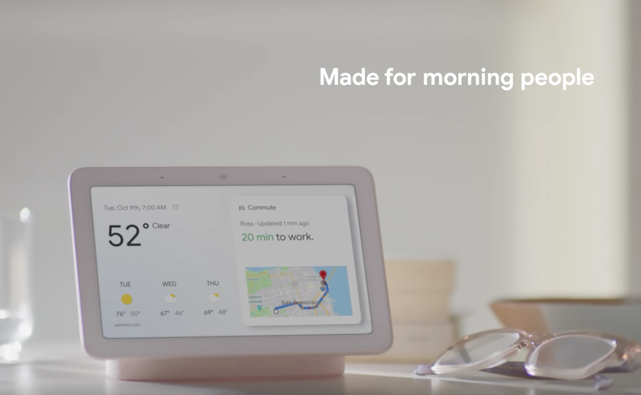 Google says the product was also purposefully made smaller in order to better fit in the home. Size wise, the device seems to split the difference between the Show and Spot. The product also features ambient light and white balance sensors to adjust to its environment. It will also shut the display off at night, when it’s time to go to bed.