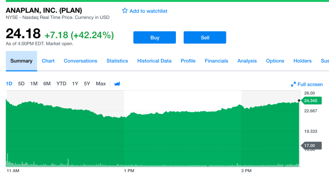 You might think that Anaplan CEO, Frank Calderoni would have had a few sleepless nights this week. His company picked a bad week to go public as market instability rocked tech stocks. Still he wasn’t worried, and today the company had by any measure a successful debut with the stock soaring up over 42 percent. As of 4 pm ET, it hit $24.18, up from the IPO price of $17. Not a bad way to launch your company.