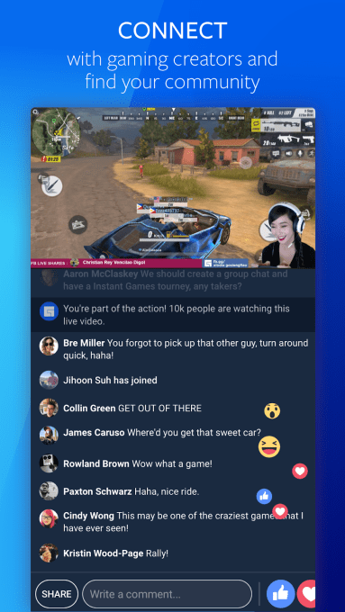 From the screenshots, you can see how the Fb.gg app lets users tap navigation buttons at the top to find streamers to watch, or to view those streamers they’re already following, among other things. They can also participate in live conversations during gameplay with other viewers. Here, they can react to the stream using Facebook’s standard emoticon set of likes, hearts, haha’s and others.