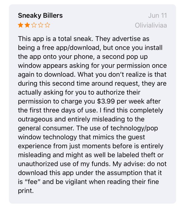 As you can tell, the issue with many of these scammy apps is that they capitalize on people not reading the fine print, or they allow an app’s design to guide them to the right button to tap. Trickery like this isn’t anything new — it’s been around on the web as long as software has been sold. It’s just that, now, subscriptions are the hip way to scam.