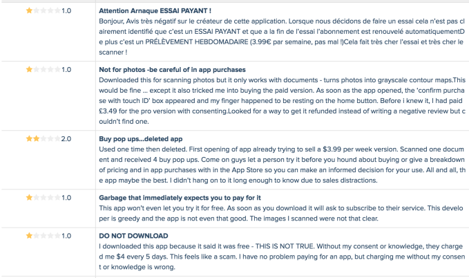 Scanner App – This No. 69 Top Grossing app is raking in a whopping $14.3 million per year for its document scanning utility, according to Sensor Tower data. It has an unbelievable number of customer reviews, as well — nearly 340,000 as of today, and a rating of 4.7 stars out of 5. That will lead most customers to believe this is a good and trustworthy app. But when you parse through the critical reviews, you’ll see some valid complaints.