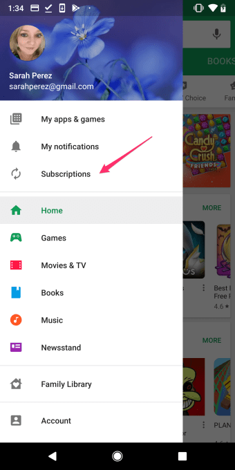 Compare Apple’s design with Google Play, where the option to manage Subscriptions is in the top-level navigation: