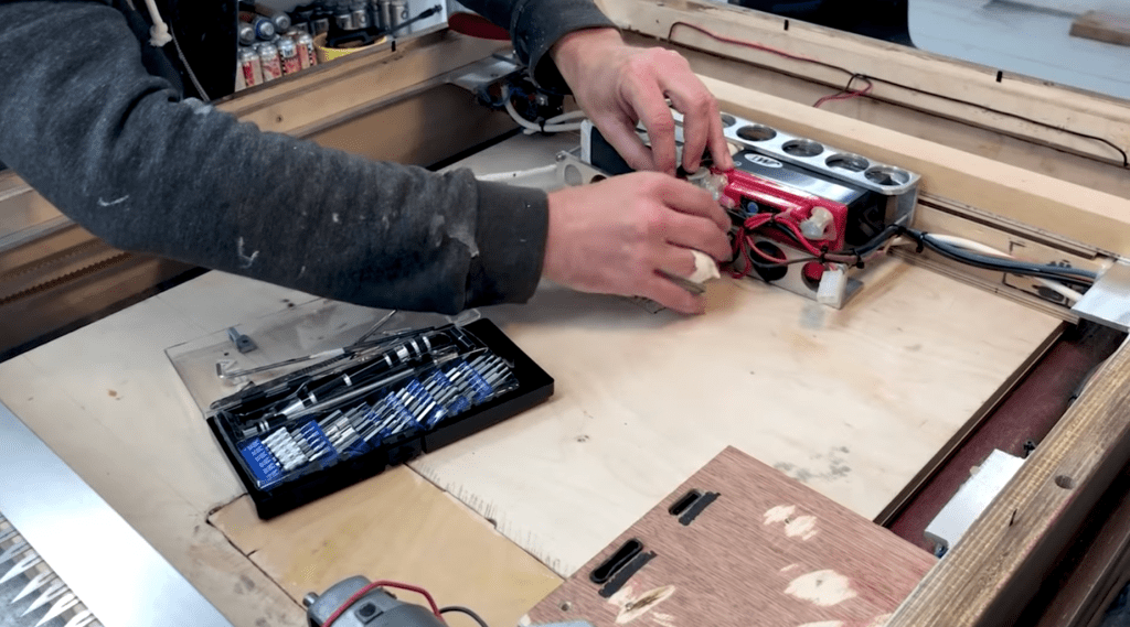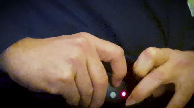 After the hammer goes down the video cuts to a close-up shot of a pair of man’s hands pressing a button on a box with a blinking red LED — presumably sending a wireless signal to shreddy to get to work…