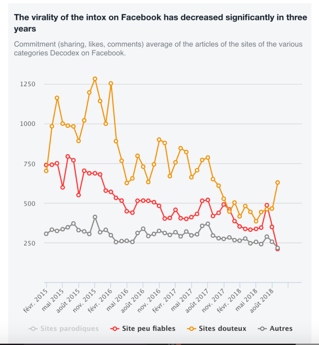 - French newspaper Le Monde looked at engagement with 630 French websites across Facebook, Twitter, Pinterest and Reddit. Facebook engagement with sites dubbed “unreliable or dubious” has dropped by half since 2015.