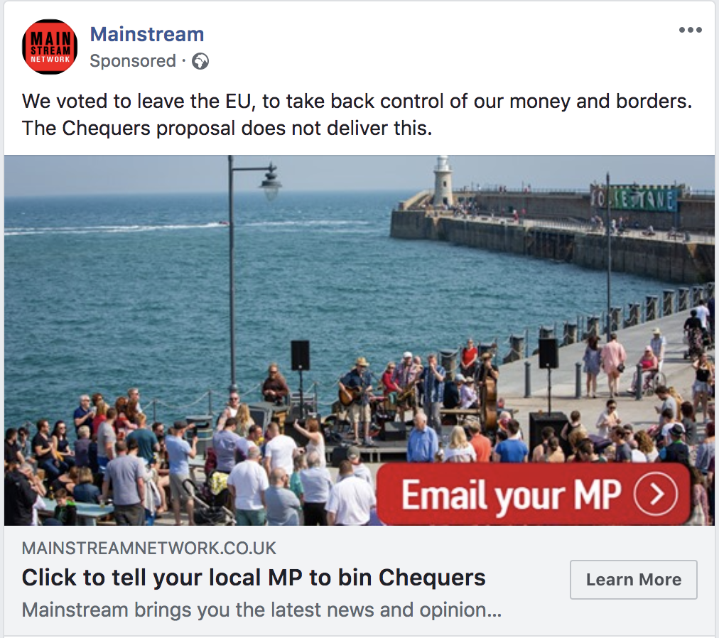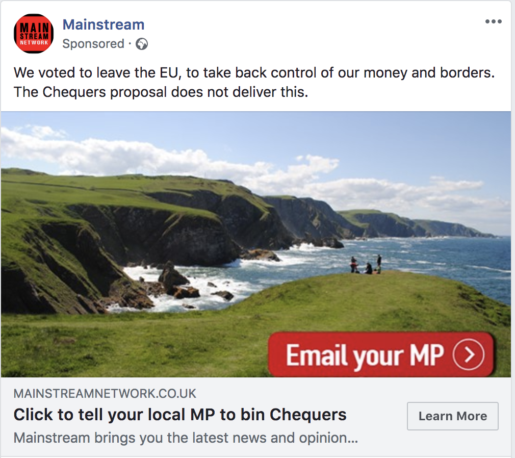 Commenting, Damian Collins MP, the Chair of the Digital, Culture, Media and Sport Committee of the U.K. House of Commons, said: “We do not know who is funding the Mainstream Network, or who is behind its operations, but we can see that they are directing a large scale advertising campaign on Facebook designed to get people to lobby their MP to oppose the Prime Ministers’s Brexit strategy. I have been sent a series of emails from constituents as a result of these adverts, in a deliberate attempt to alter the outcome of the Brexit negotiations.”