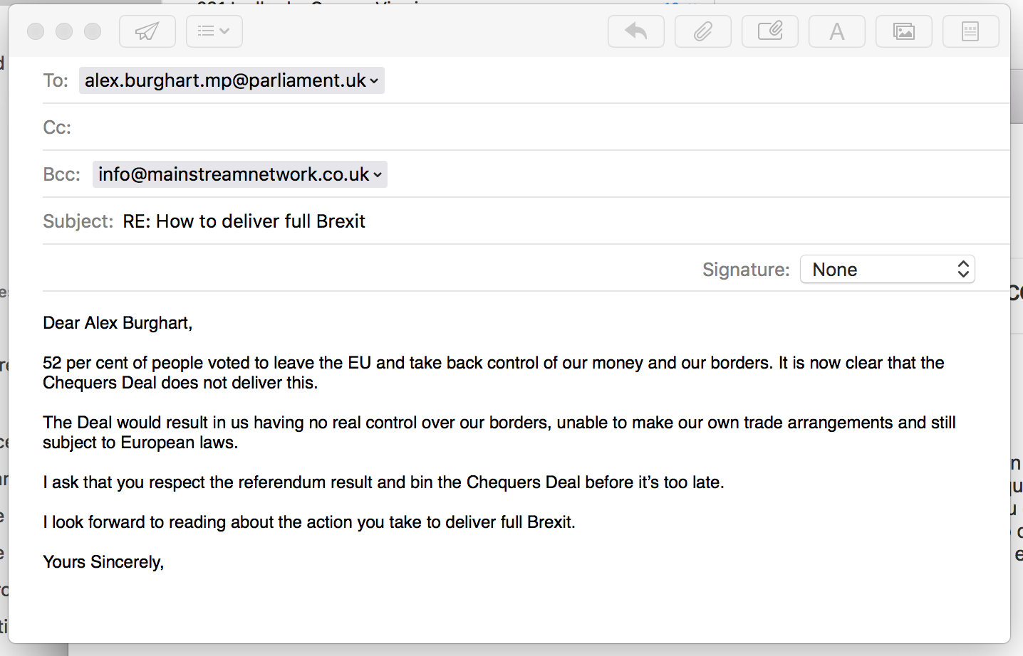 The agency says that once users are taken to the respective localized landing pages from ads, they are asked to email their MP. When a user does this, its default email client opens up an email and puts its own email in the BCC field (see below). It is possible, therefore, that the user’s email address is being stored and later used for marketing purposes by Mainstream Network.
