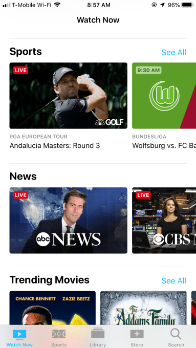 The content from those apps is then surfaced in the TV app in various ways. For instance, the Watch Now section shows you what’s available to watch across services by way of Apple’s editorial recommendations and a look at what’s trending across movies, sports, and TV. Currently, there are over 80 video apps that feed into Watch Now, including those you have the right to access after entering in your “TV provider” credentials, as well as on-demand apps.