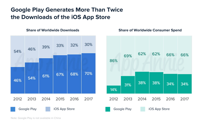 It found that, despite the large share of downloads, Google Play only accounted for 34 percent of worldwide consumer spend on apps, compared with 66 percent on the iOS App Store in 2017 — a figure that’s stayed relatively consistent for years.