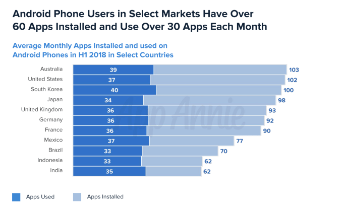 In addition, App Annie examined the app usage patterns of Android users, and found they tend to have a lot of apps installed. In several markets, including the U.S. and Japan, Android users had more than 60 apps installed on their phones, and they used more than 30 apps every month.