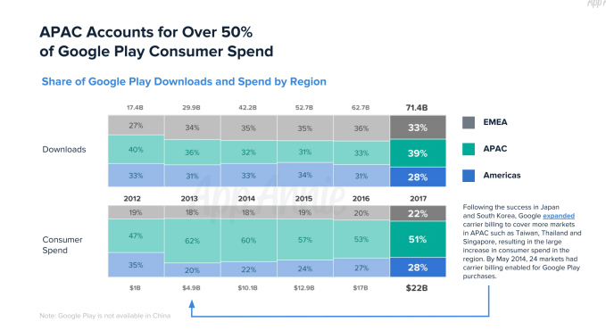 The firm attributed some of Google Play’s success in Japan to carrier billing. This has allowed consumer spending to increase in markets like South Korea, Taiwan, Thailand and Singapore, as well, it said.
