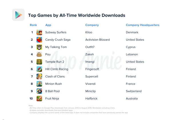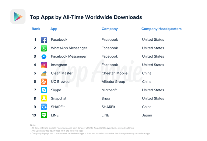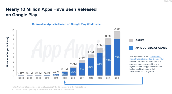 App Annie also noted Google Play has seen the release of nearly 10 million apps since its launch in 2008. Not all these remain, of course — by today’s count, there are just over 2.8 million apps live on Google Play.