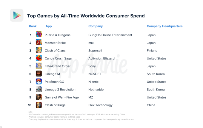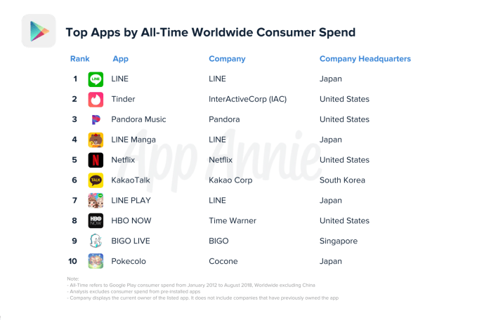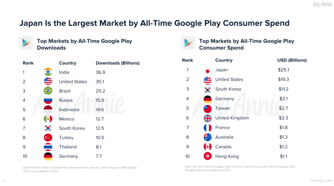App Annie also found that the APAC (Asia-Pacific) region accounts for more than half of Google Play consumer spending. Japan was the largest market of all-time on this front, topping the charts with $25.1 billion dollars spent on apps and in-app purchases. It was followed by the U.S. ($19.3 billion) and South Korea ($11.2 billion).