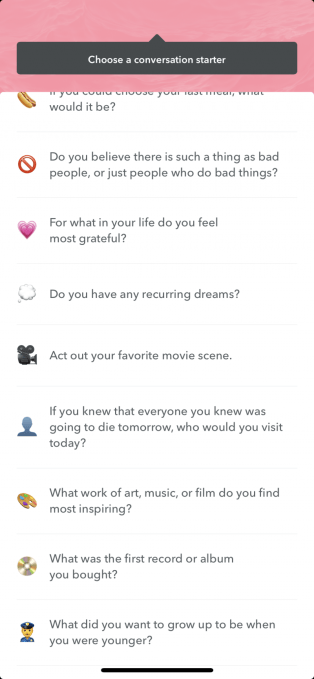 Next, you select some photos you want to feature and then choose a conversation starter. If you match with someone, you’ll record a short, pixelated video answering their question.
