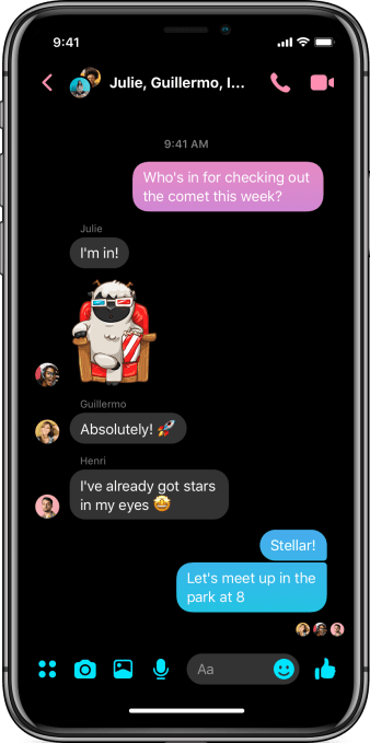 All the old features are still available, just not quite as prominent as before. The one new feature is several color gradients you can use to customize specific chat threads. If you rapidly scroll through the messages, you’ll see the bubble background colors fade through the gradient. And one much-requested feature still on the way is Dark Mode, which Facebook says will launch in the next several weeks to reduce glare and make night-time usage easier on the eyes.