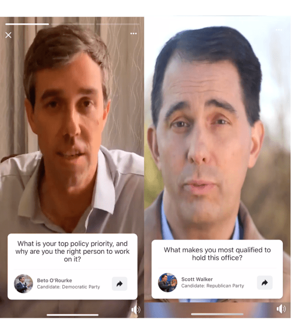 Facebook wants to make YouTube-style monologue videos the new way for politicians to talk straight with their constituency. Today, Facebook launches Candidate Info, featuring thousands of direct-to-camera vertical videos where federal, state and local candidates introduce themselves and explain their top policy priority, qualifications and biggest goal if they win office. Elizabeth Warren (D – MA Senate), Scott Walker (R – WI Governor) and Beto O’Rourke (D – TX Senate) have already posted, and Facebook expects more candidates to jump in shortly.