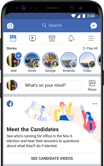 These videos will soon be available as part of an Election 2018 bookmark in the Facebook mobile app’s navigation drawer. And starting next week, the clips will begin appearing to potential constituents in the News Feed.