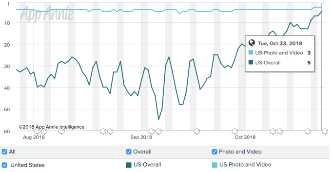 Meanwhile, TikTok is on the rise. The app has climbed from the No. 32 overall iPhone app in the U.S. three months ago to reach No. 5 today, according to App Annie.