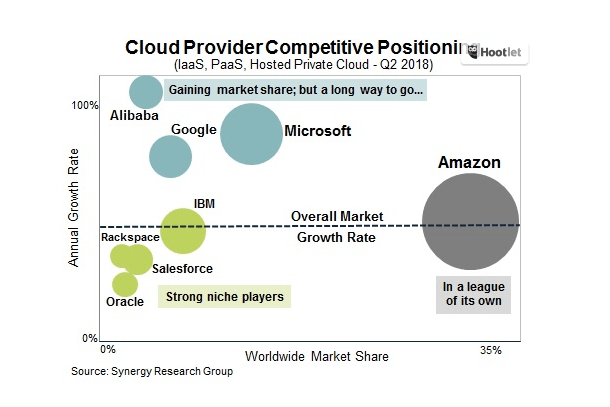 At the time, Synergy identified the four biggest players as Amazon, Microsoft, Google and IBM with Alibaba coming up fast. Synergy chief analyst John Dinsdale says Oracle is falling behind. “We have seen Oracle losing market share over the last few quarters in IaaS, PaaS and managed private cloud,” he said. “In a market that is growing at 50 percent per year, Microsoft, Google and Alibaba are all gaining market share, while the share of market leader AWS is holding steady,” he added.