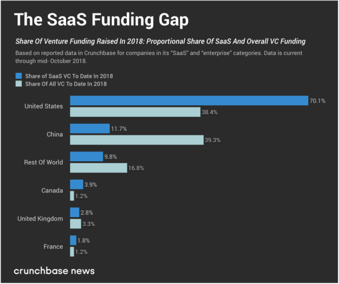 Chinese startups rule the roost when it comes to total reported venture dollars raised so far in 2018. That is, mostly. In one key category at least — software-as-a-service, better known as SaaS — they do not.