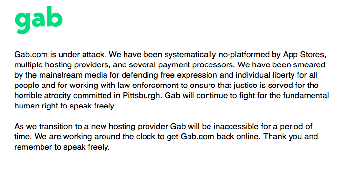 Gab now displays a message claiming it “is under attack” and has been “systematically no-platformed by App Stores, multiple hosting providers, and several payment processors.”