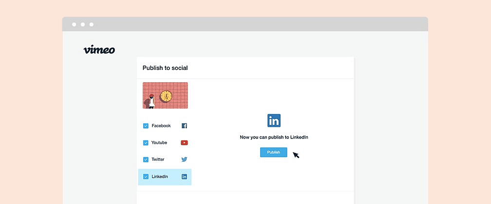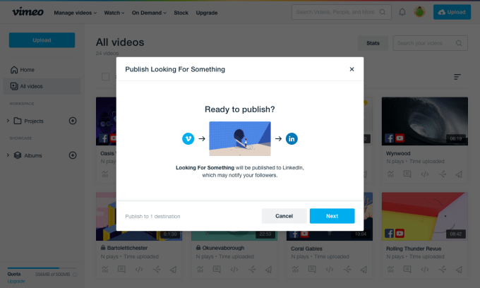 Vimeo announced today a new feature that will allow videos to be published directly to LinkedIn. The added support is a part of the company’s “Publish to Social” feature, which already offers publishing to Facebook, Twitter, and YouTube, and is available to paid subscribers. The expansion to LinkedIn is another example of the company’s shift in focus from being a video destination site to one that sells tools and services to professional and semi-professional video creators.